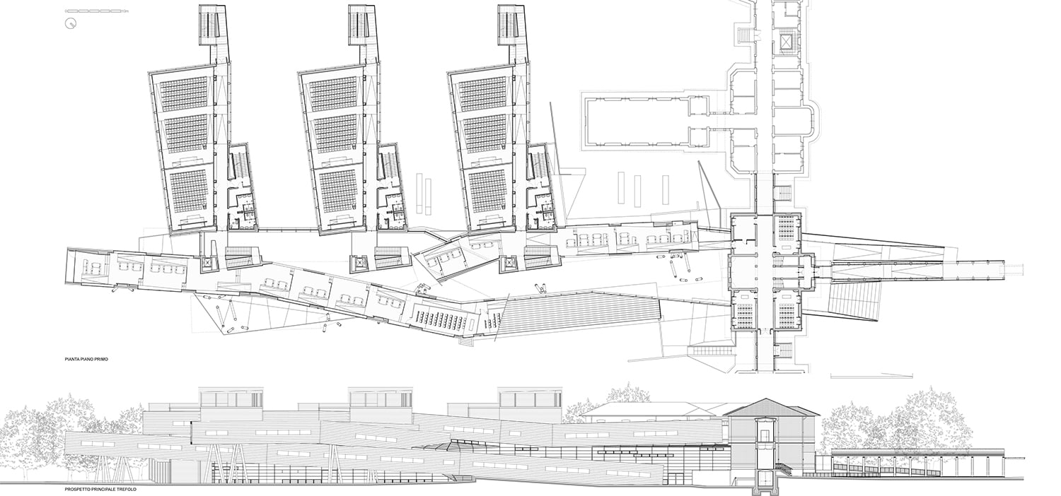 Built in multiple phases starting in 2003, the project reached its most ambitious completion in October 2014: the new Teaching Hub, composed of three classroom blocks and the “trefolo”, the system’s backbone - a long, light, transparent urban gallery opening onto the park.